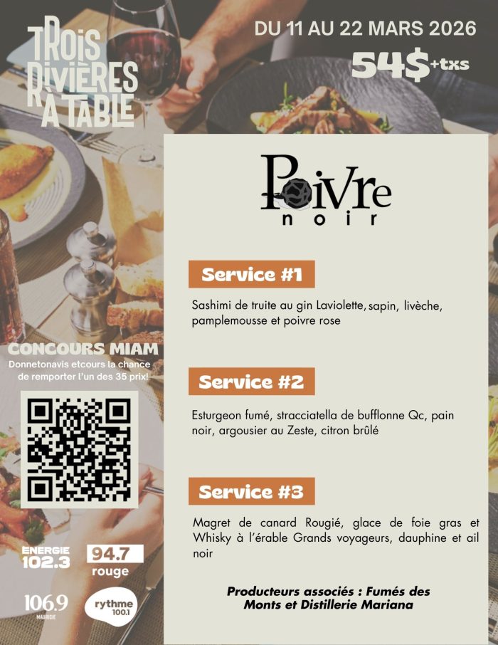 Pour l'occasion, Poivre Noir vous propose un menu 3 services mettant en lumière des produits d'exception de la Distillerie Mariana et les fumés des Monts.